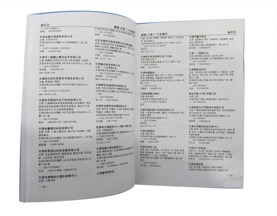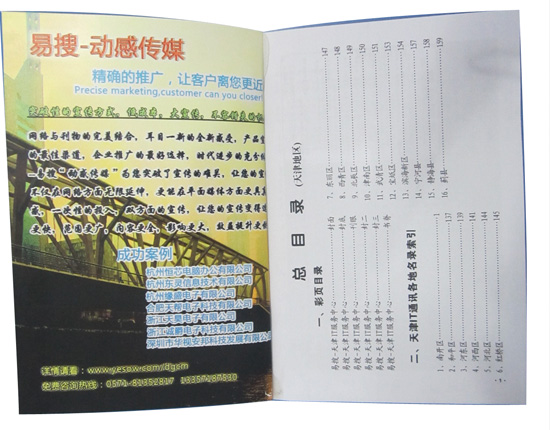 此次的天津通讯录采用二分栏格式,让商家朋友们能够准确快速的找到自己想要的信息,本书收集了天津南开区、河东区等区市及周边县市的IT商家信息,内容包括商家电话、手机、联系人、网址等(QQ、邮箱版本可特别订制,订制请上易搜商城)!!